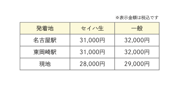 | 利用予定交通機関 | 貸切バス(名古屋国際観光バス または同等クラス) |
