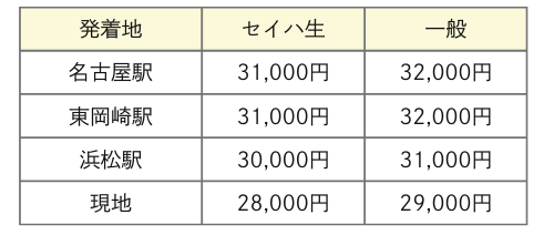 | 利用予定交通機関 | 貸切バス(名古屋国際観光バス または同等クラス) |