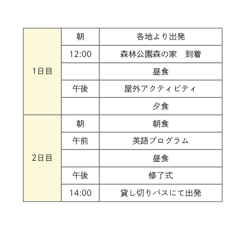 | 利用予定宿泊施設 | 静岡県立森林公園森の家 静岡県浜松市浜名区根堅2450-1 053-583-0090 |