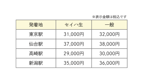 | ③新潟駅 | 3/29(日) <行き> とき12 新潟駅8:25→高崎駅9:30 3/30(月) <帰り> とき325 高崎駅15:28→新潟駅16:42 |