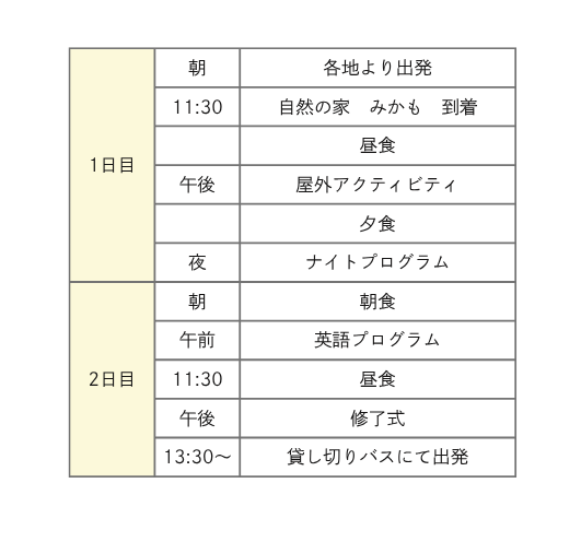 | 利用予定宿泊施設 | 自然の家みかも 栃木県栃木市岩舟町下津原1808番地1 TEL:0282-21-8799 |