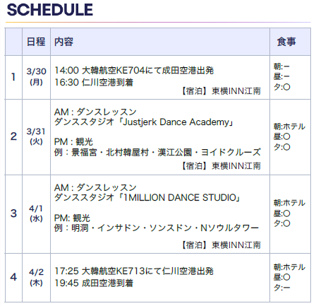 ・ダンススタジオが確定次第、スケジュールを最終決定いたします。その際観光内容が変更になる場合がございます。