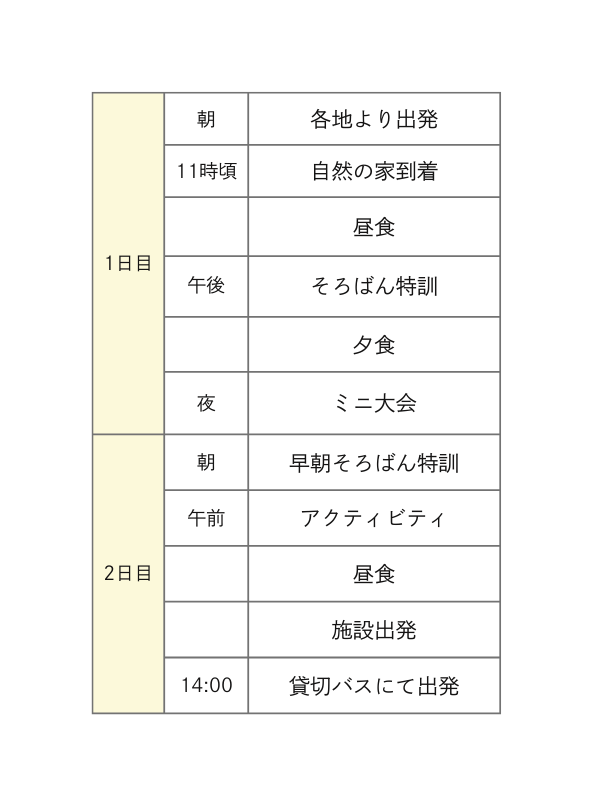 | ⑨現地 | 7/24(金)11:30頃集合 7/25(土)14:00解散 |