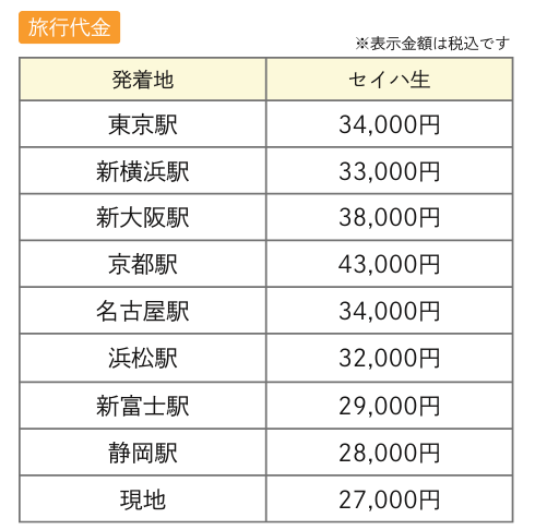 | ③新大阪駅 | 行き:ひかり500 新大阪 8:46→静岡 10:37 帰り:こだま831 静岡 15:21 →新大阪 17:51 |