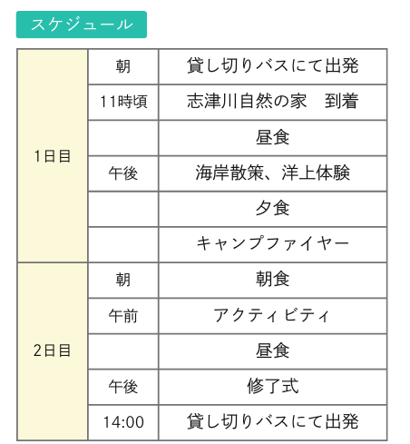 | 利用予定宿泊施設 | 宮城県志津川自然の家 宮城県本吉郡南三陸町戸倉字坂本88-1 TEL : 0226-46-9044 |