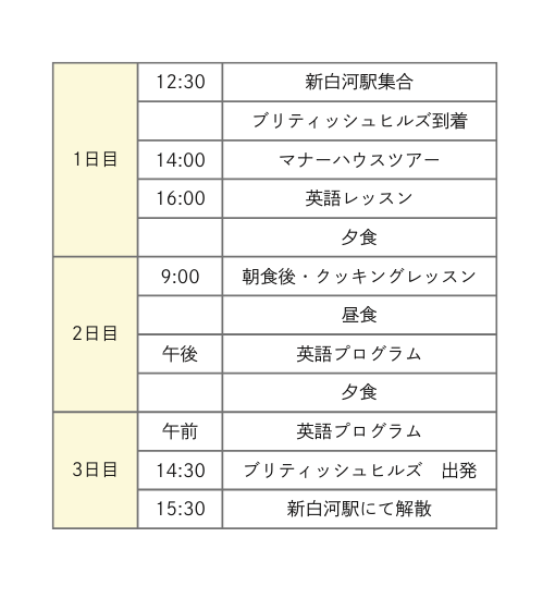 | 利用予定宿泊施設 | ブリティッシュヒルズ 福島県岩瀬郡天栄村田良尾芝草1-8 TEL:0248-85-1313 |
