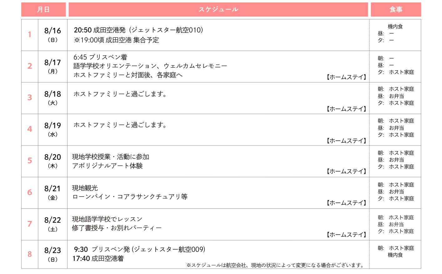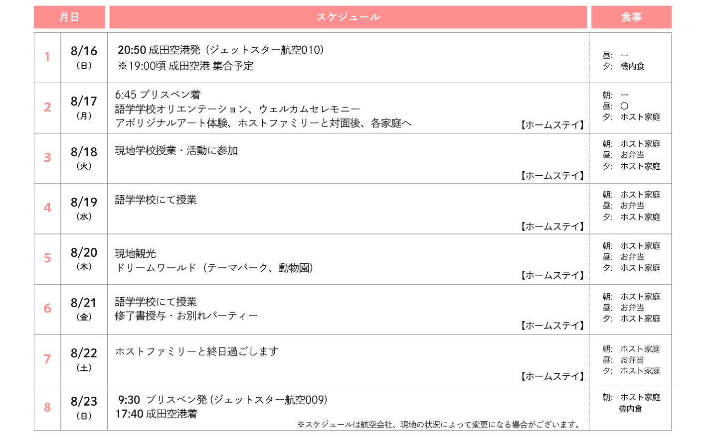 | オリエンテーション | 必ず2回ともご参加ください。 ※6~7月にzoomにて実施。日程は後日お知らせいたします。 【1回目】 渡航、持ち物等について。お子様と保護者様のご参加が必須となります。約2時間 【2回目】 オーストラリア&日本について(お子様向けグループワーク)。約1時間30分 |