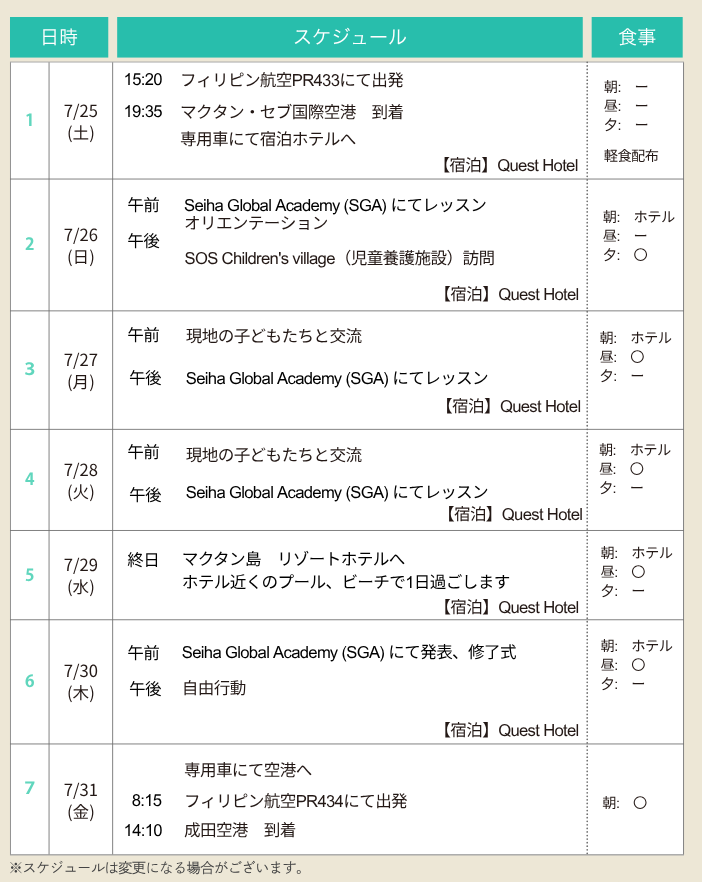 | オリエンテーション | 出発1か月前頃にzoomにてオリエンテーションを実施いたします。 当日のご案内や渡航に関すること、フィリピン・セブについて、ご案内いたします。 詳細は後日お知らせいたします。 |