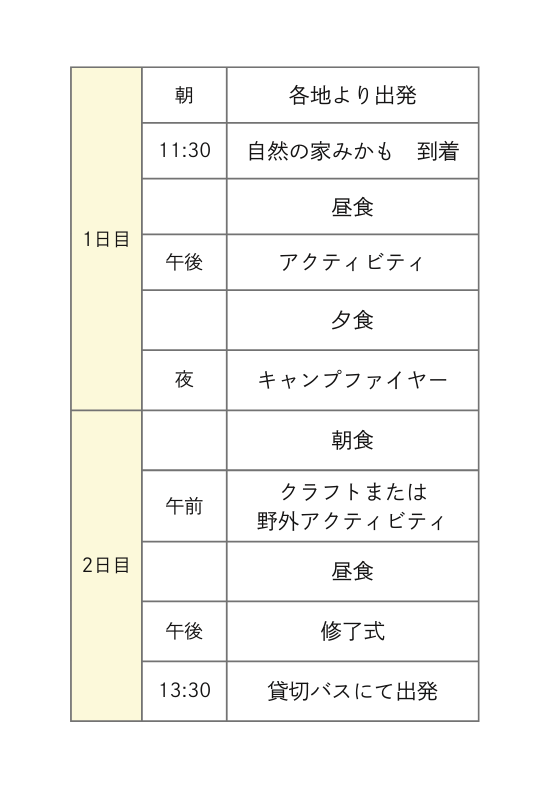 | 利用予定宿泊施設 | 自然の家みかも 栃木県栃木市岩舟町下津原1808番地1 TEL:0282-21-8799 |