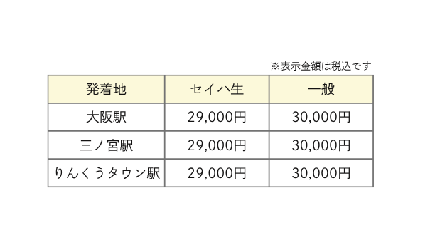 | ③りんくうタウン駅 | 3/28(土) 9:30頃 出発 3/29(日) 16:00頃 到着 |